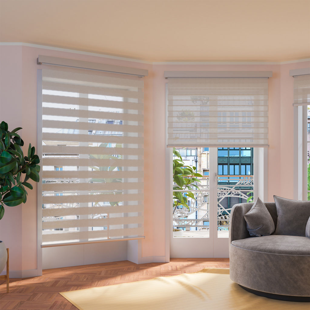 Day-night shades, also known as zebra shades, are a versatile and sophisticated solution for your windows. Their unique design alternates between sheer and opaque bands, allowing you to easily adjust light and privacy with a smooth motion. Ideal for both homes and offices, these shades add a modern touch to any space. Made with high-quality materials, they are available in a wide range of colors and textures to suit your style and decor.